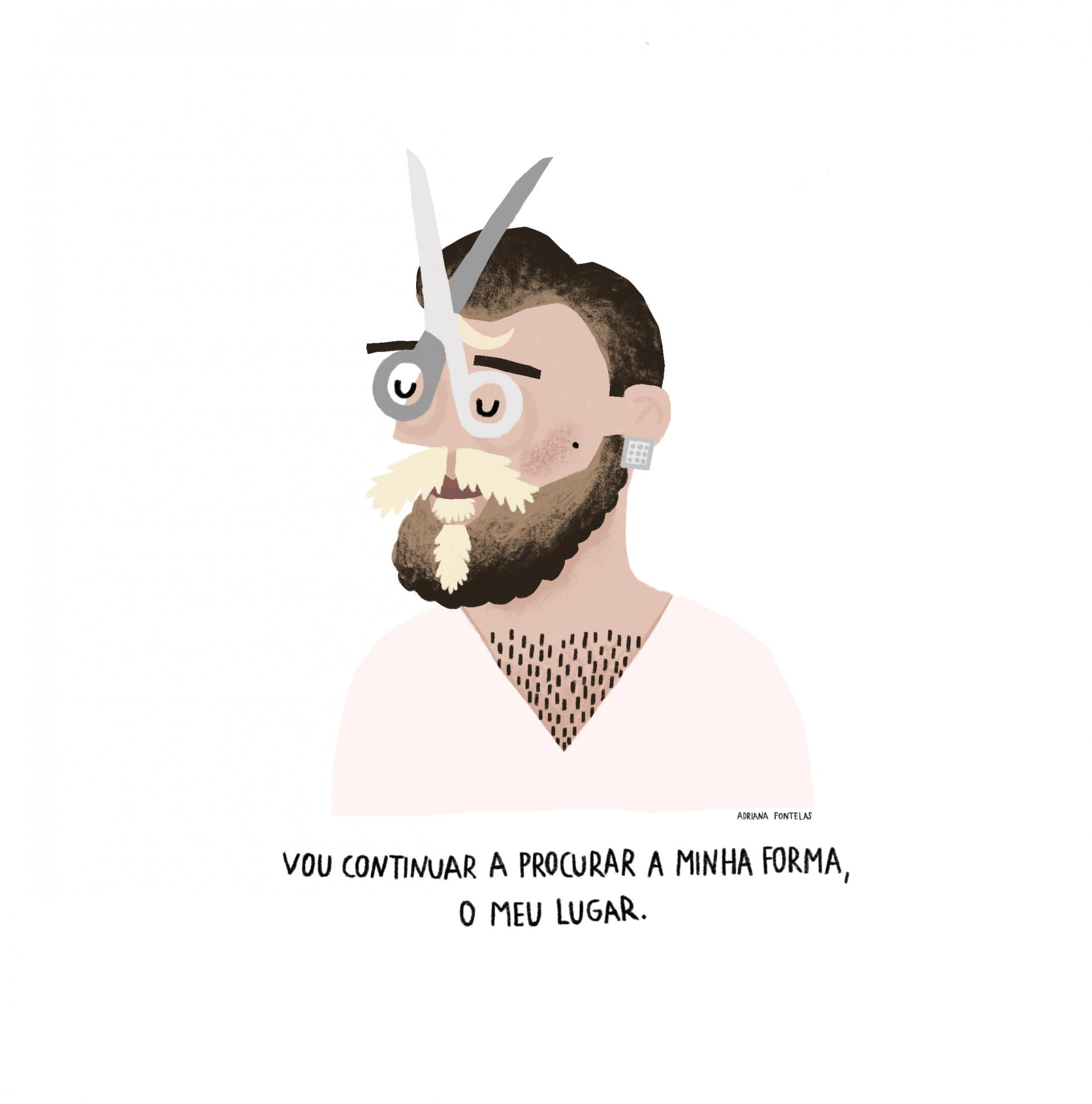 • Ilustração de homem com barba e tesoura integrada no cabelo, texto em português