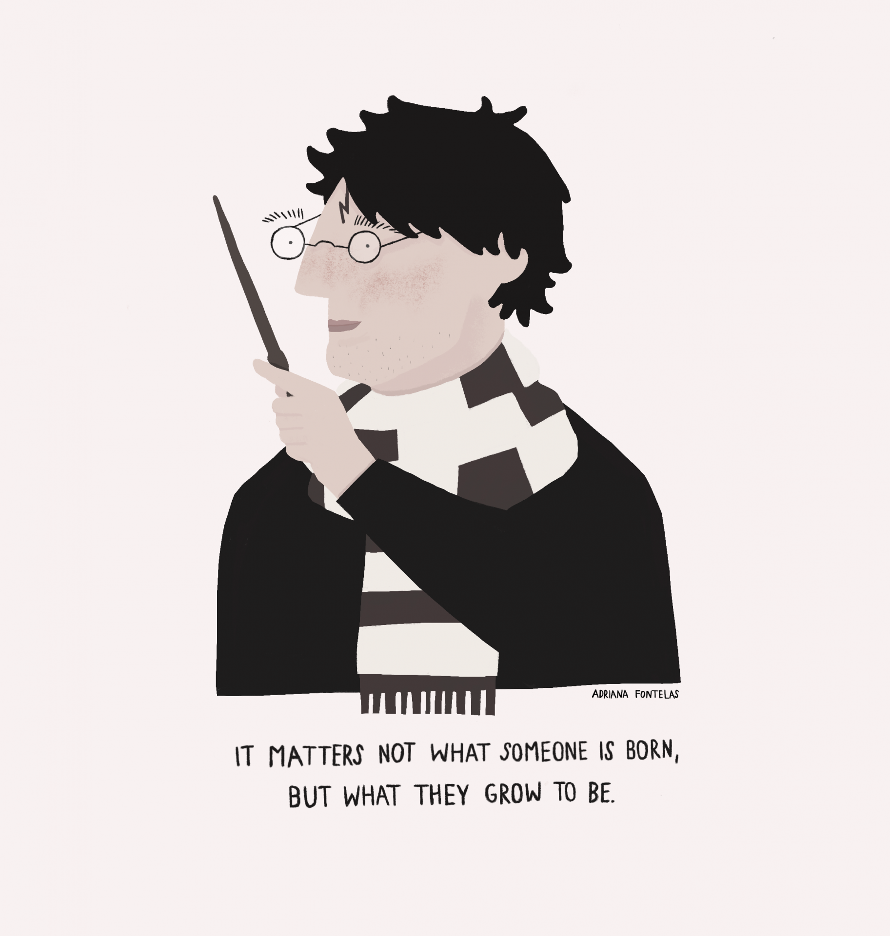Poster com ilustração de homem jovem com óculos, cachecol preto e branco e varinha, com texto inspirador.