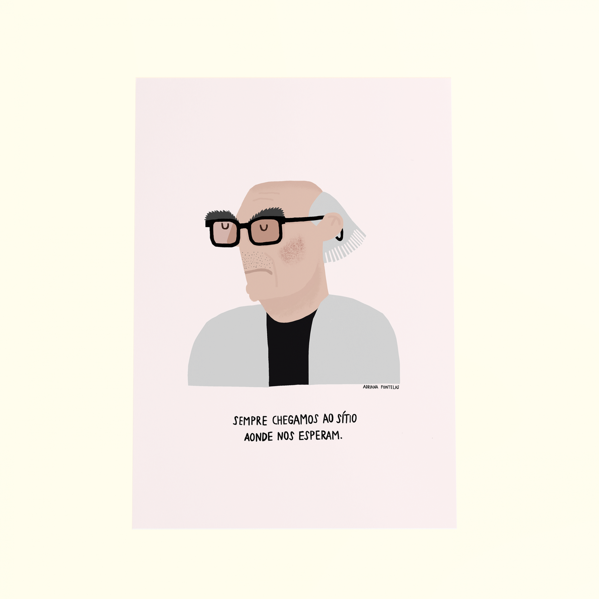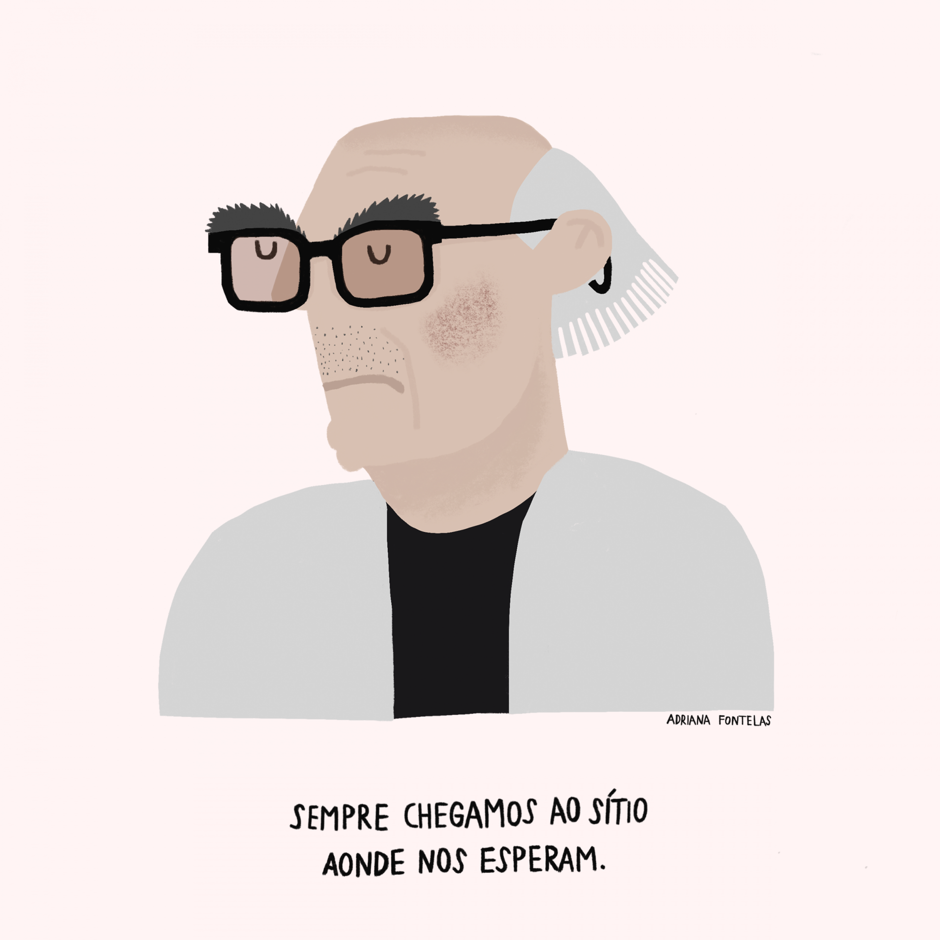 Ilustração de homem idoso com óculos pretos e texto em português no fundo claro