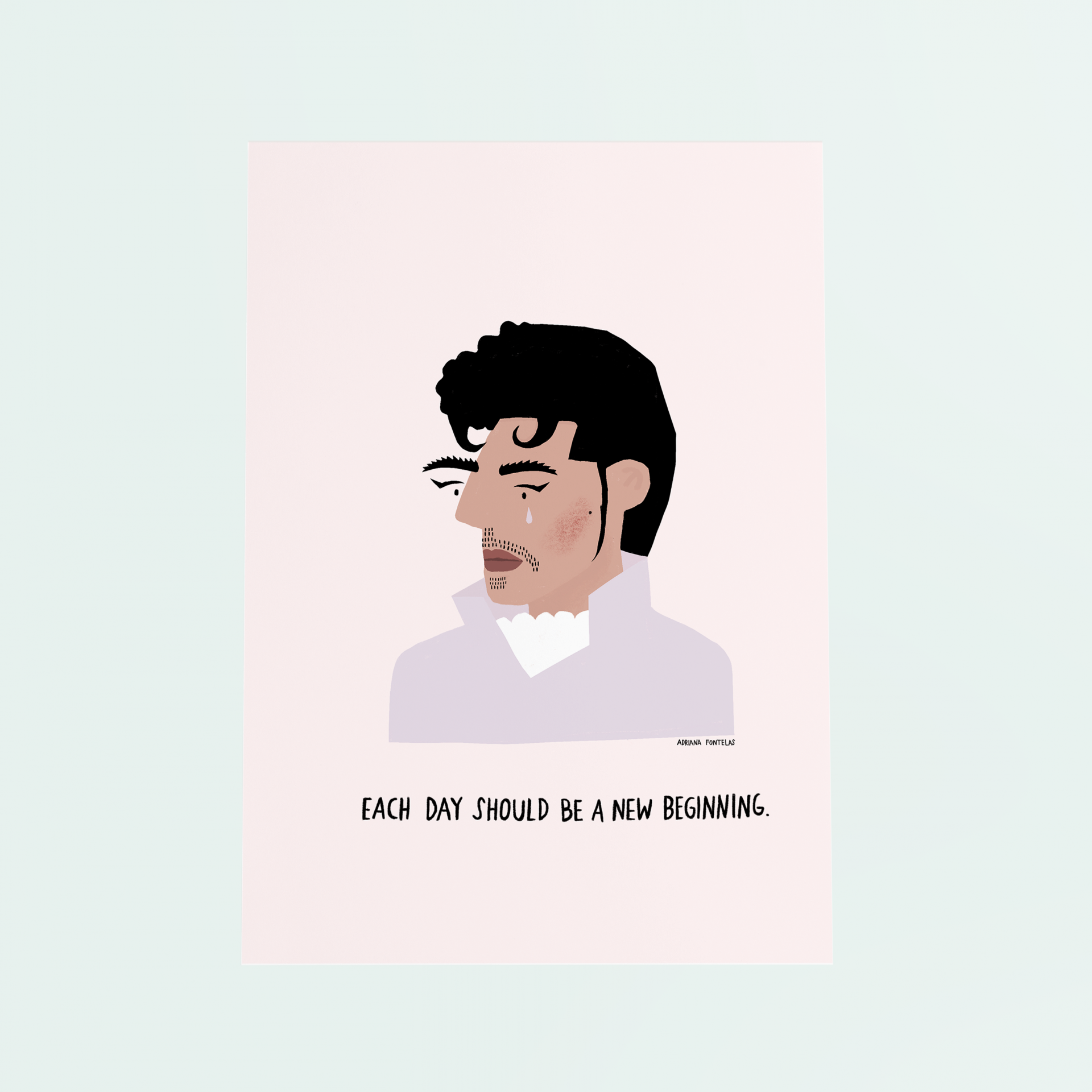 • Cartaz com rosto masculino ilustrado e texto motivacional em inglês