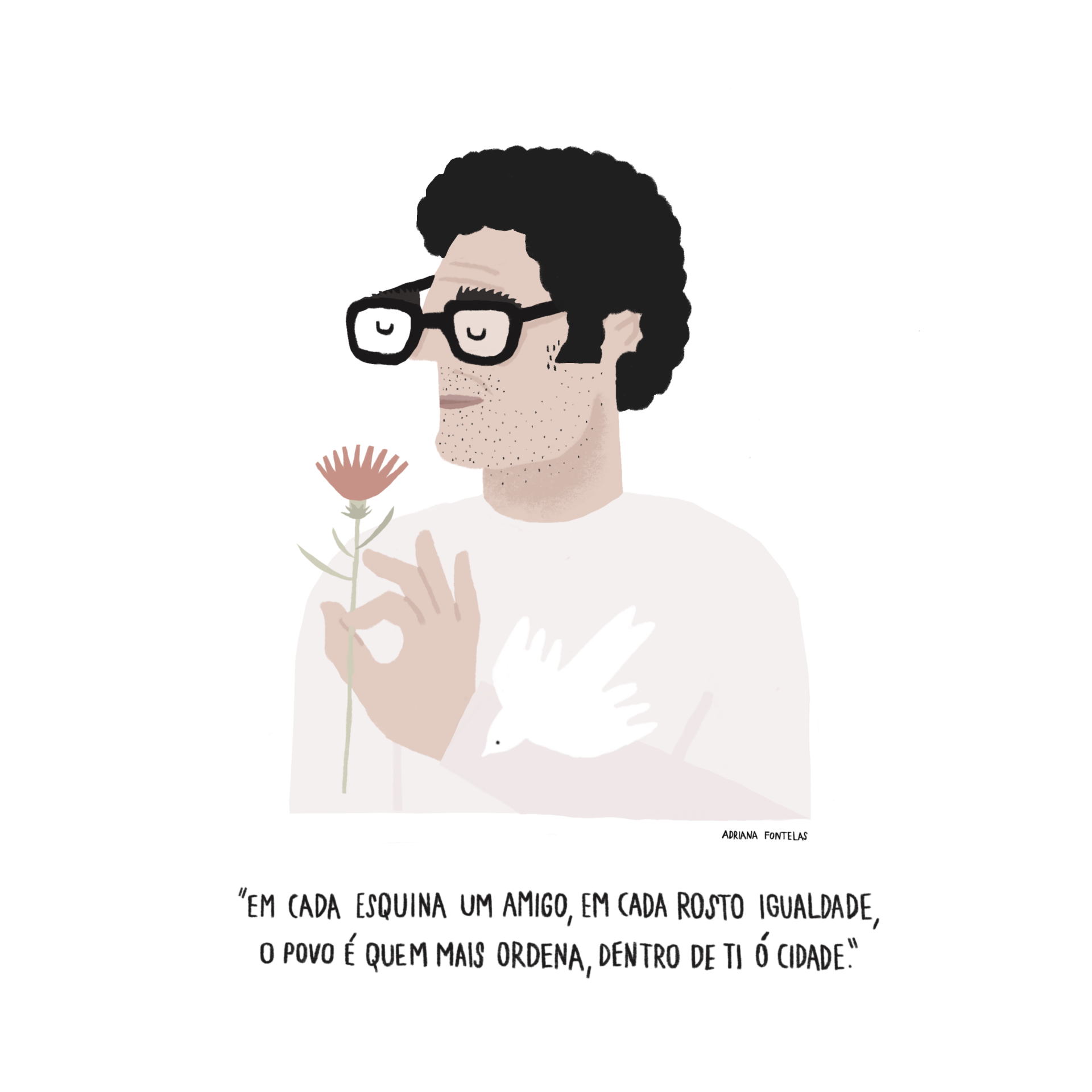 Ilustração de homem com óculos segurando flor e texto em português