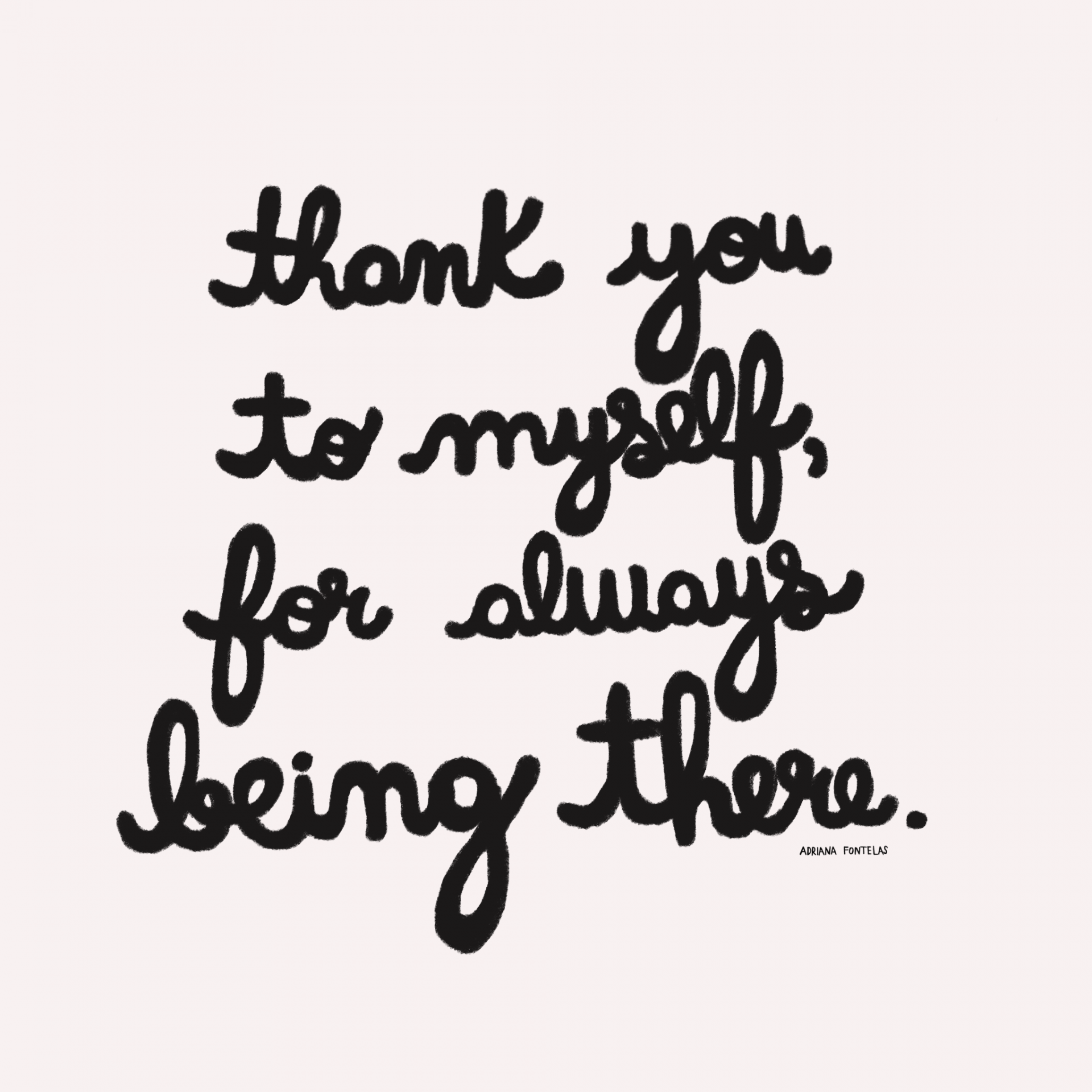 • Texto manuscrito preto em fundo branco com a frase 'thank you to myself, for always being there.'.